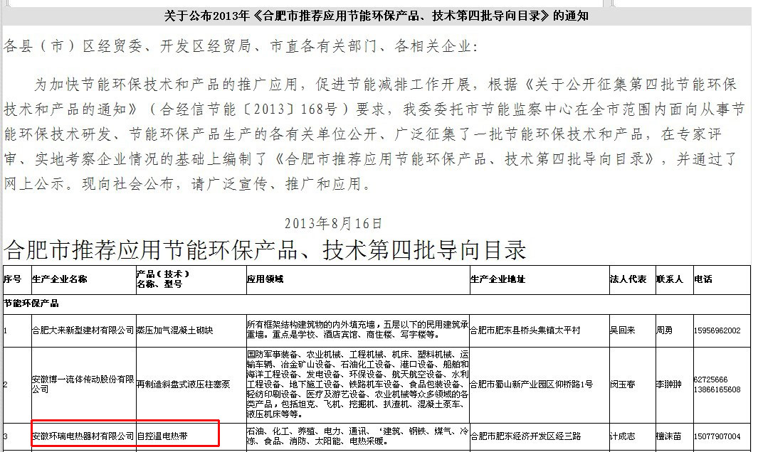 環(huán)瑞作為合肥經(jīng)濟科學(xué)建設(shè)道路上的重要成員,一直朝著“科技環(huán)瑞,電熱成就世界”的偉大藍(lán)圖邁進(jìn),其具有低電阻過渡層的自限溫電伴熱產(chǎn)品先后獲得省,市關(guān)于科技成果的榮譽有:合肥市科學(xué)技術(shù)獎,安徽省高新技術(shù)產(chǎn)品,合肥重點名牌產(chǎn)品。國家7項專利證書。其環(huán)保節(jié)能的特點已經(jīng)獲得政府、行業(yè)協(xié)會,及市場的認(rèn)可。目前,環(huán)瑞公司已通過了合肥市推薦應(yīng)用節(jié)能環(huán)保產(chǎn)品、技術(shù)目錄的公示,獲得了環(huán)保節(jié)能產(chǎn)品稱號,以下為合肥經(jīng)濟和貿(mào)易信息化委員會網(wǎng)站的公示內(nèi)容: